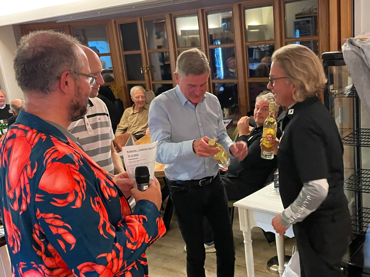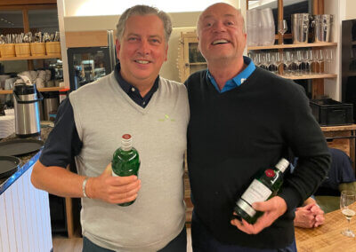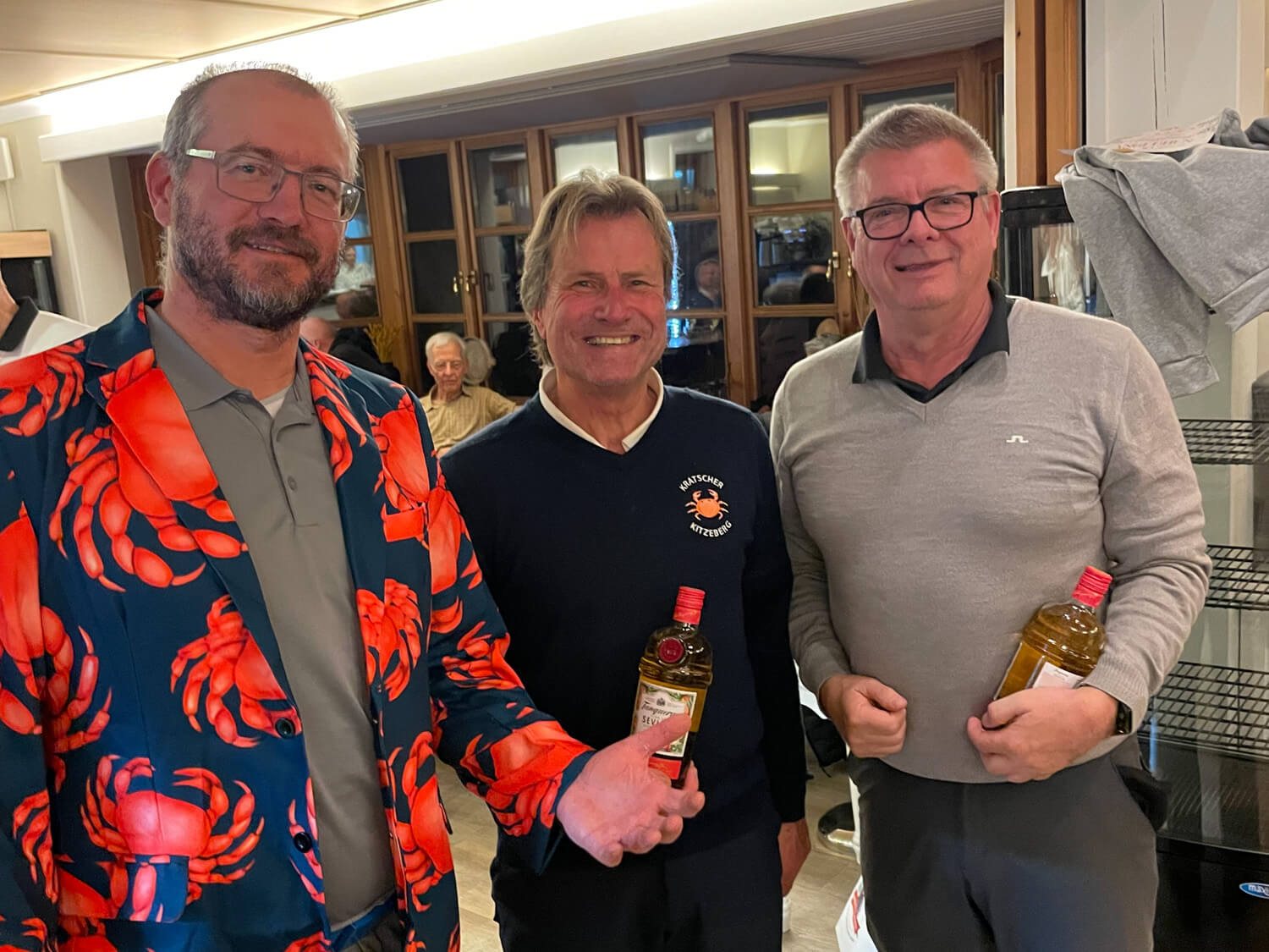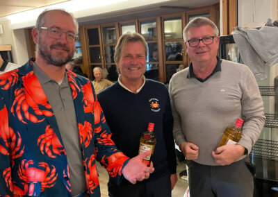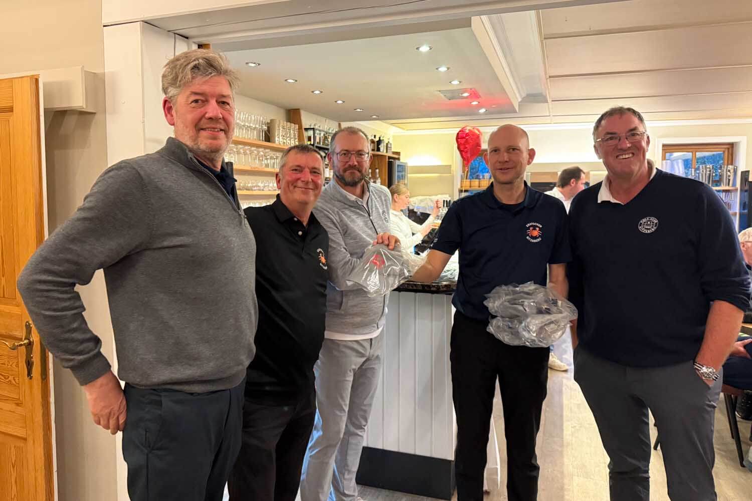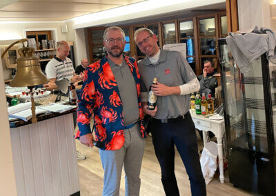 Im Hauptfeld 19 Loch Golf freute sich, war völlig überrascht, Bernhard Grimm: Doppelschlag Brutto- und Nettoerster, das hatte er wohl noch nie. 13 Pars, 3 Bogeys, 2 Doppelbogeys ergaben 64 Nettoschläge und 78 Bruttoschläge, Glückwunsch Bernhard! Natürlich griff hier der Doppelpreisausschluss, er bekam nur 1 Glas und nicht 2… Der gut spielbare Platz ermöglichte aber noch mehr tolle Ergebniss e: Volker Balke und Thorsten Tennstedt mit 66 Nettoschlägen, Frank Stark und Hagen Jessen mit 67 und 68 Nettoschlägen und trotz der Bürde des Amtes, Tim Dahmke mit 69 auch noch unter 70 Nettoschlägen. Am längsten war diesmal Volker Balke, am genauesten Wolle Becker (5m reichten aber nicht zum Birdie). Um das beste Birdie wurde hart gestritten. Es gab 2 beste Birdiesauf der 17, aber wegen des höheren Handicaps gewann im Stechen Volker Balke. Das Nachsehen hatte Thorsten Tennstedt. Ach ja, da gab es noch die goldene Krabbe… diesmal für Thomas Christoph, der sich sichtlich freute 🤣.