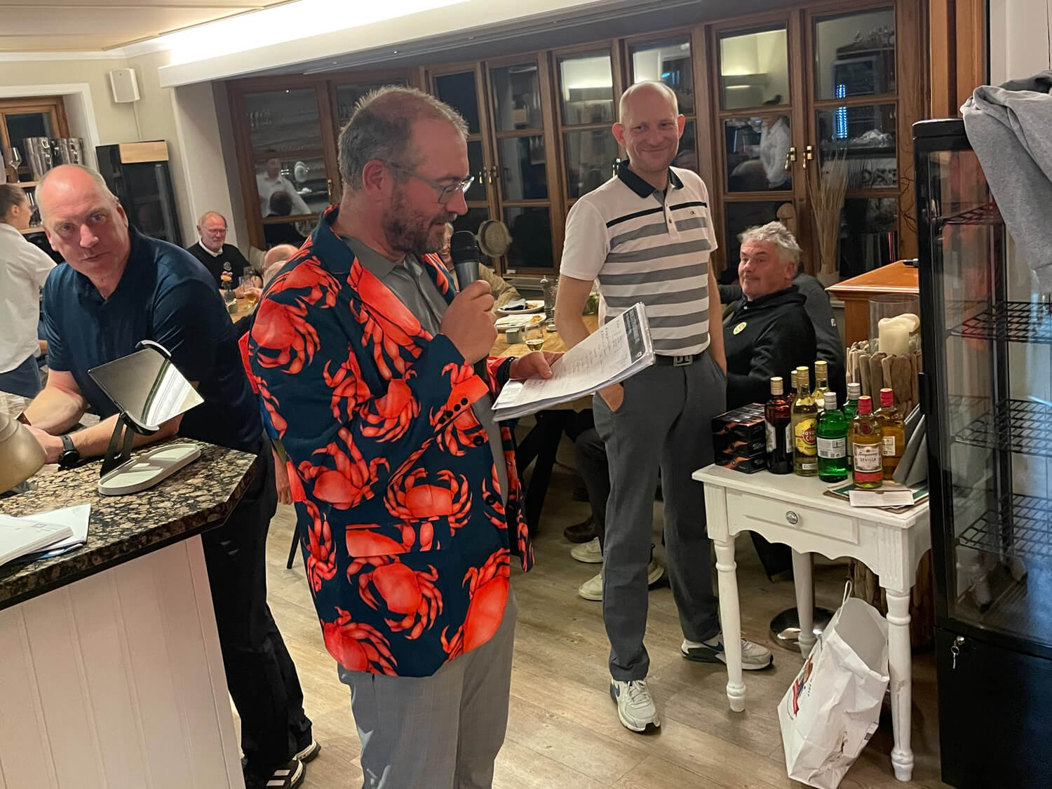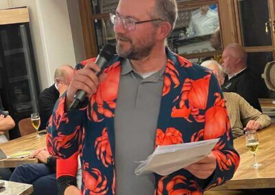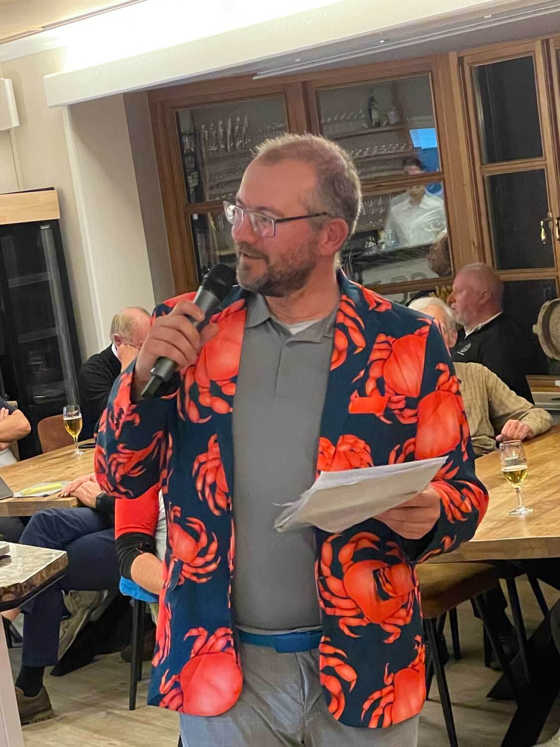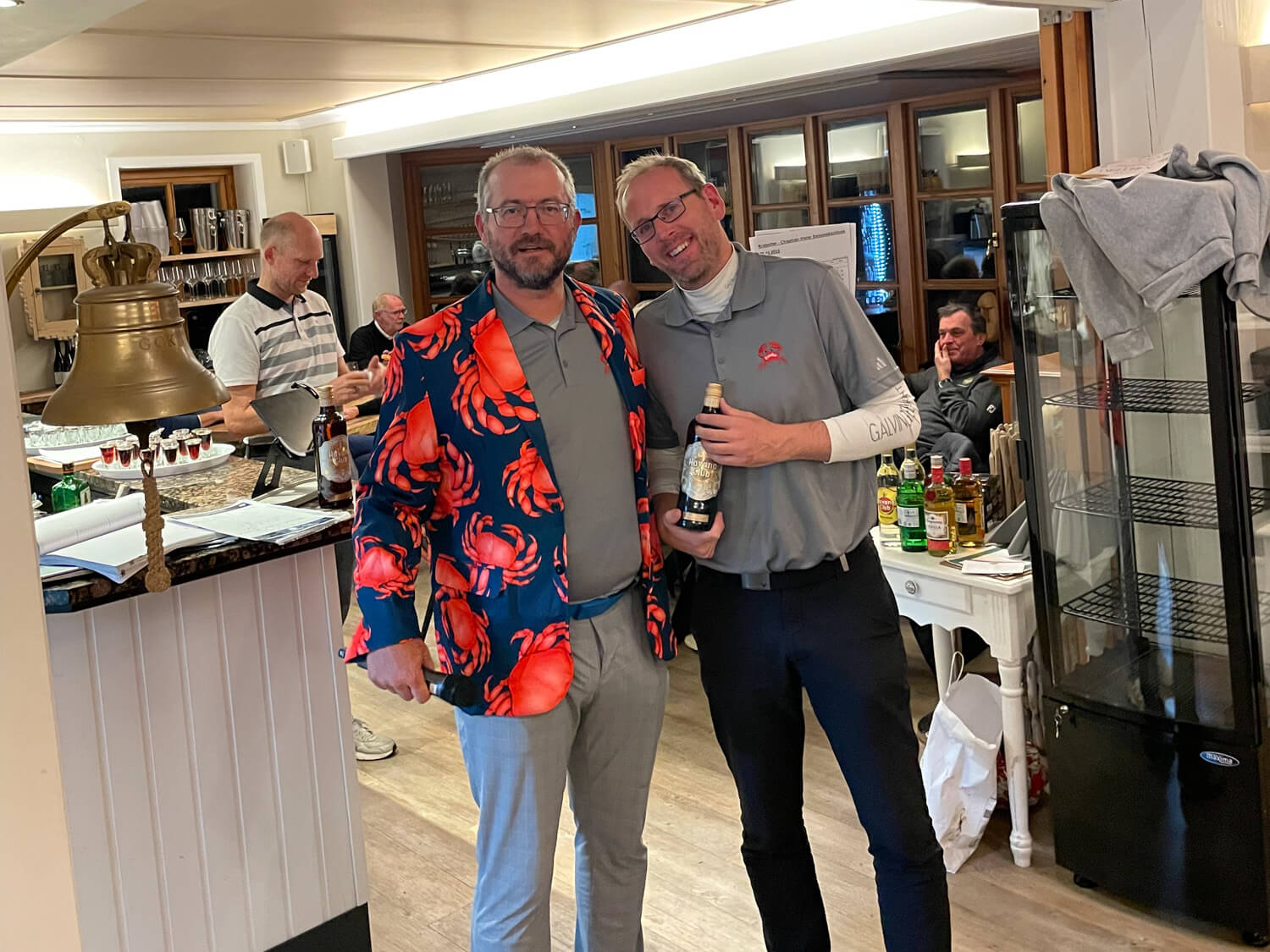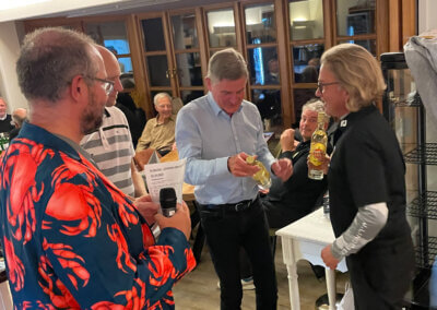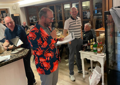 Im Hauptfeld 19 Loch Golf freute sich, war völlig überrascht, Bernhard Grimm: Doppelschlag Brutto- und Nettoerster, das hatte er wohl noch nie. 13 Pars, 3 Bogeys, 2 Doppelbogeys ergaben 64 Nettoschläge und 78 Bruttoschläge, Glückwunsch Bernhard! Natürlich griff hier der Doppelpreisausschluss, er bekam nur 1 Glas und nicht 2… Der gut spielbare Platz ermöglichte aber noch mehr tolle Ergebniss e: Volker Balke und Thorsten Tennstedt mit 66 Nettoschlägen, Frank Stark und Hagen Jessen mit 67 und 68 Nettoschlägen und trotz der Bürde des Amtes, Tim Dahmke mit 69 auch noch unter 70 Nettoschlägen. Am längsten war diesmal Volker Balke, am genauesten Wolle Becker (5m reichten aber nicht zum Birdie). Um das beste Birdie wurde hart gestritten. Es gab 2 beste Birdiesauf der 17, aber wegen des höheren Handicaps gewann im Stechen Volker Balke. Das Nachsehen hatte Thorsten Tennstedt. Ach ja, da gab es noch die goldene Krabbe… diesmal für Thomas Christoph, der sich sichtlich freute 🤣.