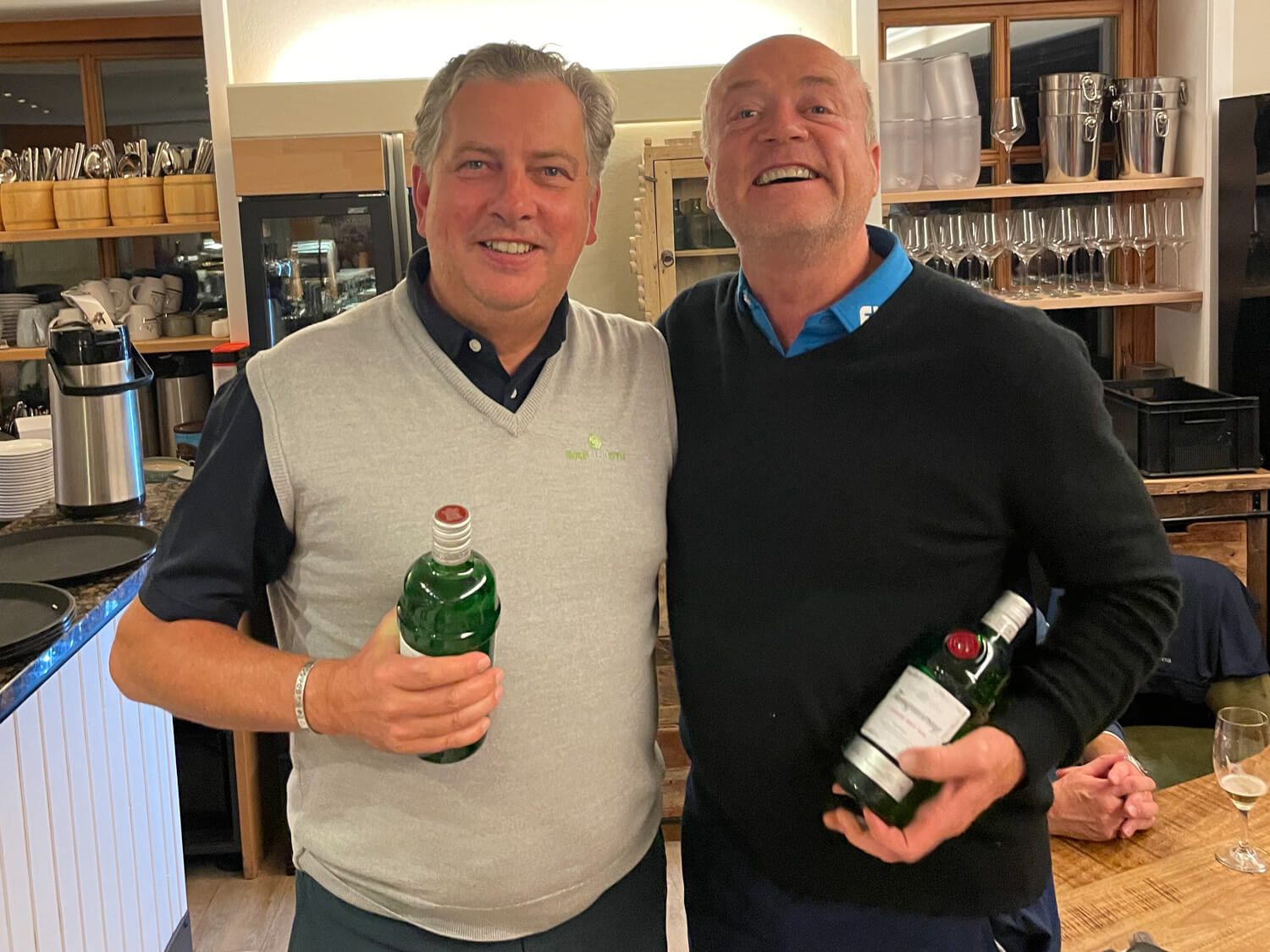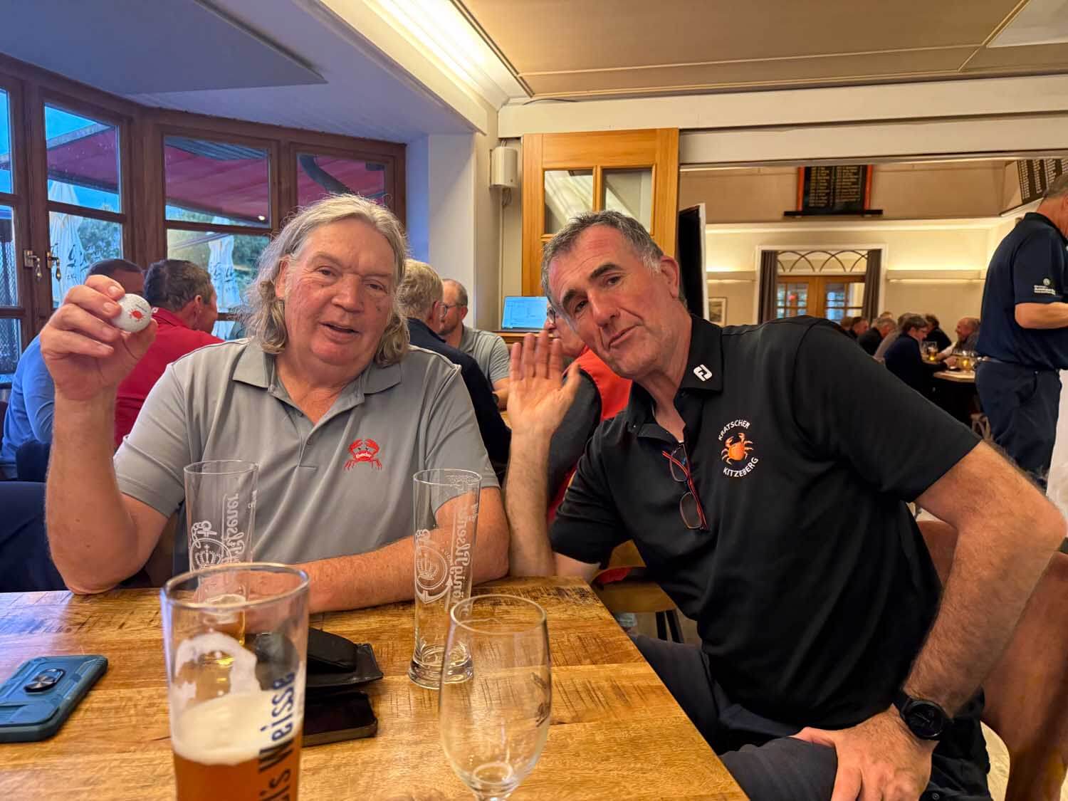 Kein Wind, kein Regen, durch die Nässe der vergangenen Woche ist alles am Wachsen, wunderbare Golfbedingungen. Aber der Kratschervater entschied: noch nicht perfekt, deshalb Besserlegen auf Kurzgemähtem. Eigentlich der Tag für Paddy: mit 30 Brutto und 40 Netto fehlte nicht viel zum Sieg in beiden Klassen, aber das Lochwettspiel steckte ihm wohl noch im Kopf (kaum zu glauben, Max-von bügelte ihn ab…), so wurde er „nur“ Brutto- und Netto Zweiter. Ganz nett, aber netter war der Tag für Thorsten Riesenberg, nicht gerade bekannt für erste Plätze, spielte er groß auf und sicherte sich mit 41 Netto den ersten Platz. Und standesgemäß tat es ihm gleich – der Gastgolfer vom Golfclub Sylt 🤣, Christoph Eltester mit 31 Punkten als Bruttoerster. Am 19. Loch schmeckte beiden das gemeinsame Bier deshalb besonders gut (Foto). Das Besserlegen nicht so gut – konnte heute Hansi Meier, er erhielt zum Trost die goldene Krabbe. Er dachte, er kommt drum herum, war weg, aber die Krabbe wird ihm nächste Woche von Tim an die Backe geklebt. – Das Ärgernis Birdiepool war einmal, der Pool passte perfekt. Leider lag das am geänderten Modus, Haken vorm Spiel, und bezahlen nach dem Spiel bei Thorsten Tennstedt…. Schade, schade, dass es so weit kommen musste 😖. Den Pool teilten sich heute die Kratscher Rainer Gertung (Loch 6), Tim Dahmke (Loch 6), Hagen Jessen (Loch 8) und Paddy Heuer (Loch 8). Und dann kam da auch noch Kurt Heimann, das erste Birdie an Par 3 der 9 Loch Golfer seit ?? Paddy lag mit 1,51m Nearest to the Eight und Olaf Lübcke Nearest to the Fourteen. 2x NP, um auch die 9 Loch Golfer zu bedienen! Die jungen Longhitter waren diesmal bestimmt wieder long, lagen aber wohl alle neben dem Fairway. So sicherte sich Christoph Eltester den Longest Drive. Das beste Birdie spielte Hans Mattheisen (alias Matthiesen) auf Loch 9. Weiter geht die wilde Jagd auf Kratscherpunkte.