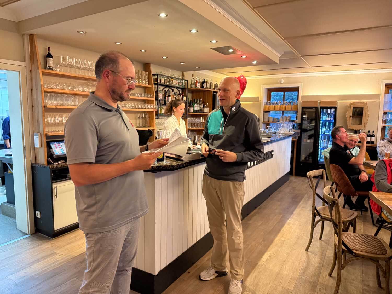 Sonnig, kaum Wind, perfekte Bedingungen, um sich nochmal zu unterspielen. Besonders gut machte es diesmal Paddy Heuer. Dreiunddreißig Bruttopunkte, da staunte Seriensieger Thomas Hahn (29 Brutto). Für beide ergab sich eine Unterspielung: Paddy von 9,3 auf 8,3 und Thomas von 6,8 auf 6,6. Auch im Netto war Paddy ganz vorne. 43 Netto hat man als Singlehandicapper auch nicht jeden Tag 🤣 – aber leider Doppelpreisausschluss… Und dann auch noch den Longest Drive gewonnen. Glückwunsch an Paddy! Es war der Tag des Paddy Heuer. Im 9 Loch Wettbewerb ein neues Gesicht. Rolf Gertung war auf der Kurzdistanz voll dabei, spielte 20 Netto, was für eine Unterspielung reichte und natürlich 3 Kratscherpunkte.