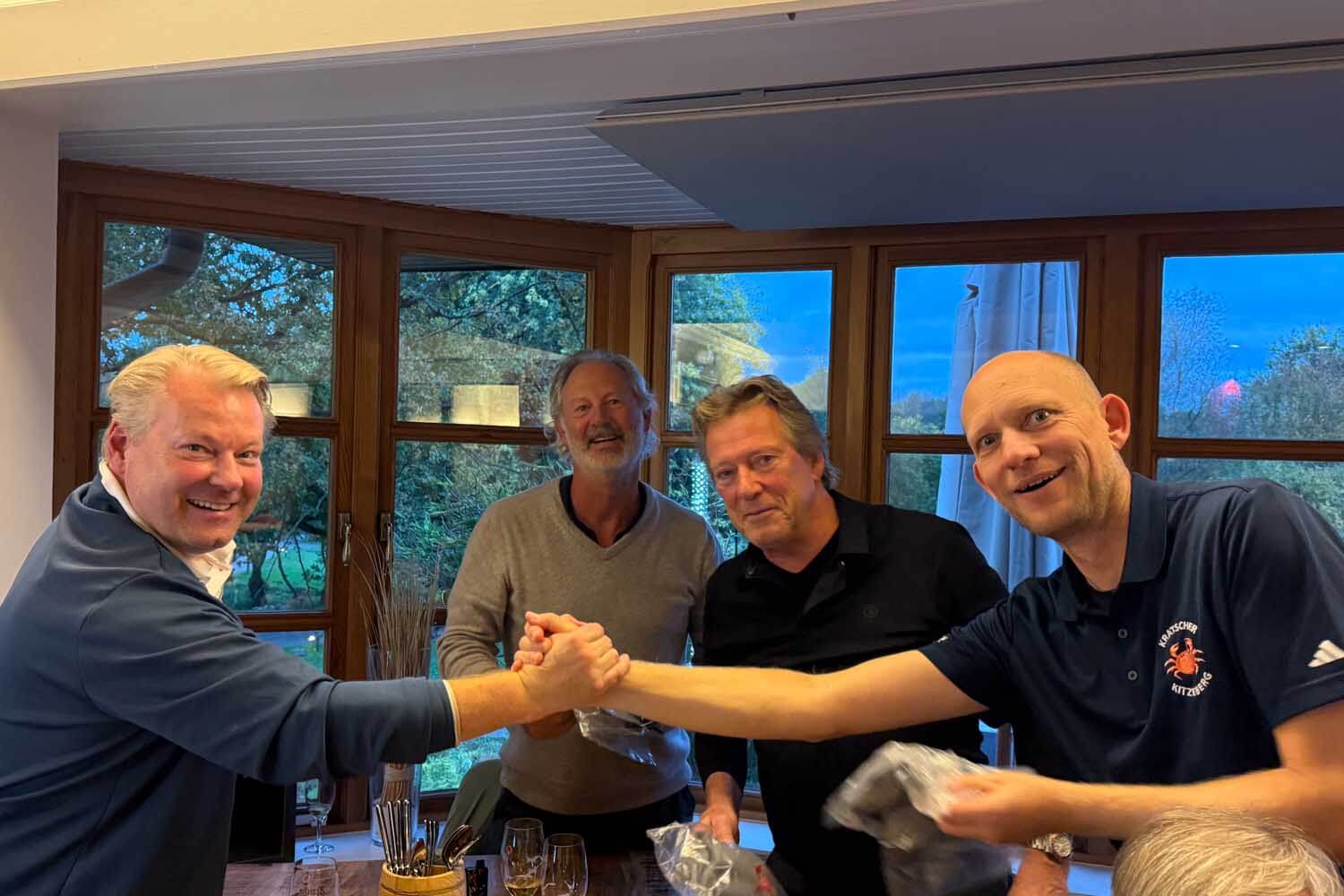 Neue Besen kehren gut – so gab es, von Tim verordnet, den bei den Kratschern noch nicht gespielten Scramble. Die Hoffnung war, einmal im Jahr mal PGA-Style Ergebnisse zu erzielen. Vier Spieler, vier Chancen auf richtig niedrige Ergebnisse. Und so kam es auch: Bruttosieger wurden Paddy, Tim, Michael Stauch und Enrico mit 8 unter Par, gefolgt von Christoph Eltester, Ulli Beck, Cliff und Andreas Oberschelp mit 5 unter Par. Die ersten Zehn Teams blieben unter Par! Bei dem tollen Ergebnis wurden Paddy und Co. auch Nettosieger mit 52 Nettoschlägen. Dabei sollte erwähnt werden, dass die Playing Handicaps nicht das übliche Mittel aus 4 waren, sondern nochmal durch 2 geteilt wurden. Also ganz so einfach war es dann doch nicht, gute Nettoergebnisse zu erzielen. Im 9 Loch Wettbewerb ist ja die Beteiligung generell sehr übersichtlich. So ergaben sich mit 5 Teilnehmern 2 Teams. Eberhard Ruprecht, Siegfried Kaiser und Michael Brumm setzten sich mit 40 Bruttoschlägen und 32 Nettoschlägen gegen Kurt Heimann und Heiner Stelter durch.